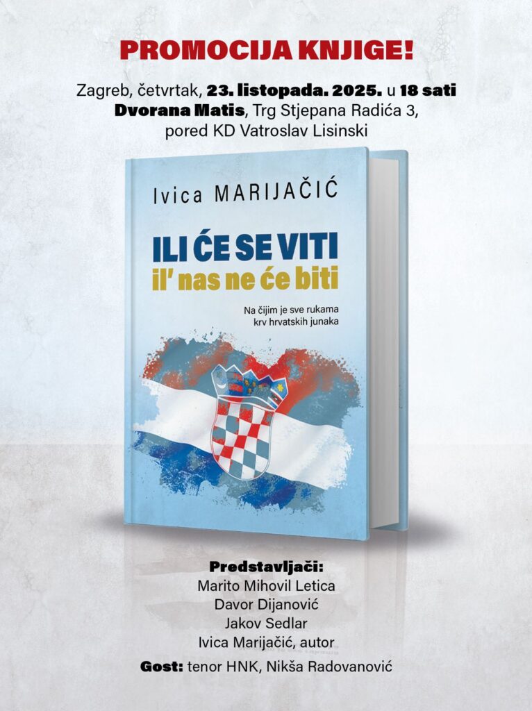 U četvrtak, 23. listopada 2025. godine u 18 sati, u dvorani Matis (Trg Stjepana Radića 3, Zagreb), u neposrednoj blizini Koncertne dvorane Vatroslava Lisinskog, održat će se svečana promocija knjige Ivice Marijačića pod naslovom „Ili će se viti il’ nas ne će biti – Na čijim je sve rukama krv hrvatskih junaka“.